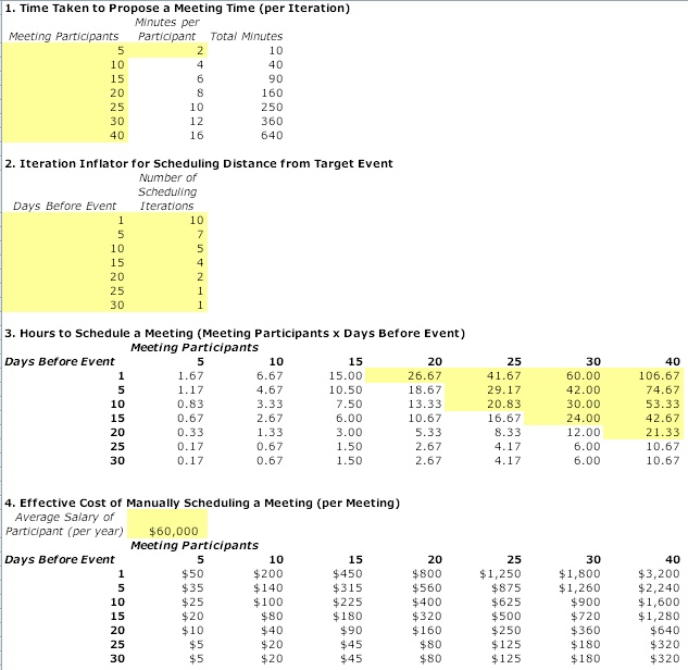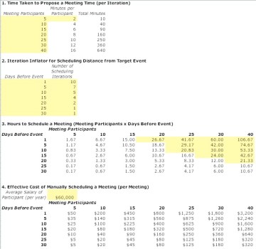 - Table 4 … A calculation of the cost across the group for manually scheduling a single meeting … scheduling that is, not attending. Vendors that can remove the friction from this process through automated free/busy services could use these numbers to show the return on investment possible via an purchase (not money saved however, rather time that can be used for more profitable activities).