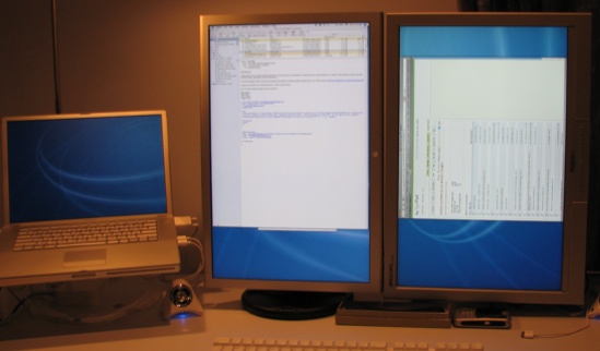 The first 23″ monitor is displaying at 1200×1920 (due to being in portrait mode), and I wanted the ability to do it with a second one too (you can never have too much screen real estate!). The VTBook looked like the ideal solution … except that it does not support screen rotation … a “feature” I only discovered after getting the VTBook, a VESA adapter for my Cinema Display, and a Visidec stand to flip it. That’s not a good time to discover that it won’t work! Look closer at the second screen … the browser is sideways. And there’s no way to flip it.