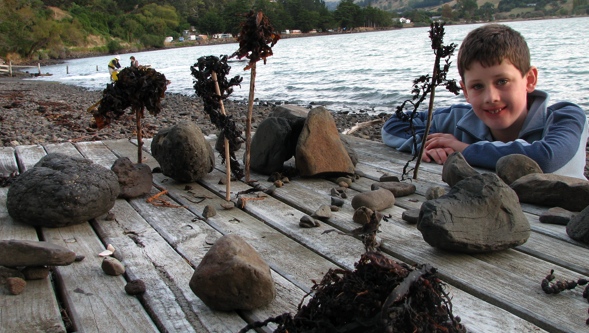 - Good Friday fell this year on the 6th, which is also Katrina’s mother’s birthday. They were holidaying and sailing over at Pigeon Bay, so we drove the 2 hours and shared the afternoon with Wayne and Edna. Matthew made the most of the beach artifacts–here’s his wonderful Easter garden. We left a bit too soon after dinner, however, and after driving up out of the valley, Tim lost his food at the top of the hill. Poor kid.