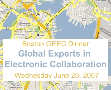 I’m attending the Enterprise 2.0 Conference in Boston MA during the week starting June 18, 2007. If you are into collaboration, how about joining me for dinner on Wednesday night for an informal shared meal for GEECs, Global Experts in Electronic Collaboration? The last one … in June 2005 … was great fun!