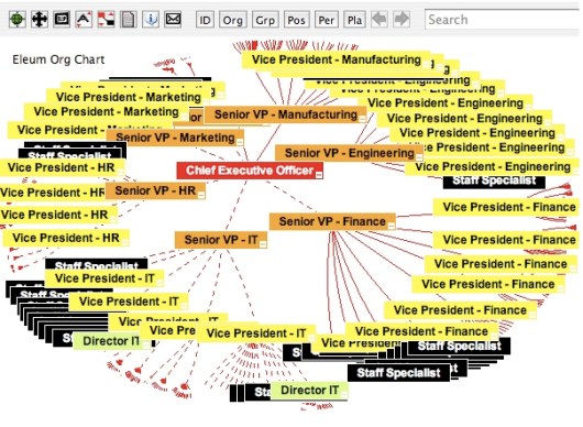 To support their work, they have created a software tool called “OrgScope”, which takes information from the corporate HR system (or an LDAP directory), and as long as it includes the name of each person’s manager, can graphically model the organization using techology licensed from Inxight Software (recently acquired by Business Objects). See NetAge for a Web-based version of this.