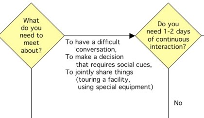 Oscar and Jessica have been working out a checklist for when you need in-person meetings, based in part on a desire to reduce CO2 emissions. In the spirit of collaboration, I’ve taken their checklist and made a flowchart out of it for those that like things visually …