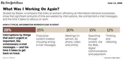 - Basex outlines how the typical information worker spends their time, and calls out the problem of too many interruptions.