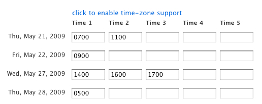 When other people go to fill out the poll, they see green and red boxes for when other people can and cannot attend … again, showing the current status of the meeting at a social level — who can come at what times, who can’t come (see below). This should, hopefully, send the subtle message that if you are late to respond, that you shouldn’t deadlock the meeting if you can avoid doing so. Once again, note that there is no integration with the participant’s calendar, for seeing these meeting times in context of the other things they are committed to doing.