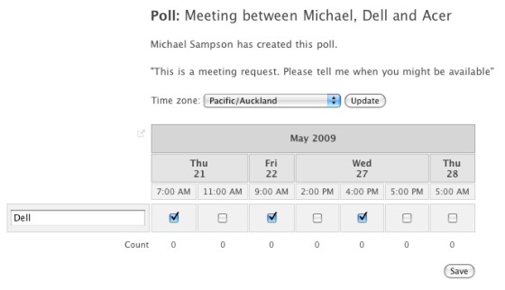 Once you have set up the parameters for the meeting, Doodle provides you with two links: one for participants to fill out the poll, and one for the administrator (the meeting creator) to see the current state of the meeting. The idea is that you then email the participant link to those you want to attend the meeting, asking them when they might be able to attend. For example, here’s the Participant Link for the meeting below. In the screen shot below, Dell is filling out when he’s available.