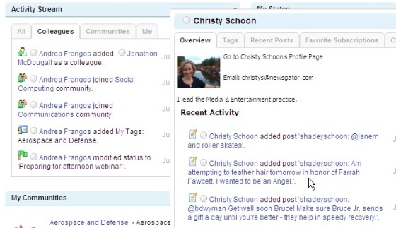 - A global consulting and research firm (Gallup) … business need was higher productivity, customer service, reduced learning curve, and more efficient access to experts. When requests came in from clients, they took from days to a week to find the right people to answer the question. Created a very detailed profiling capability on its people to aid in finding. [Greg showed the profiling capabilities of NewsGator Social Sites, including the network graph. The network graph is clickable, so you can drill down. A second way to find an expert in Social Sites is to use the Knowledge Explorer, a tag cloud driven way of finding people.]