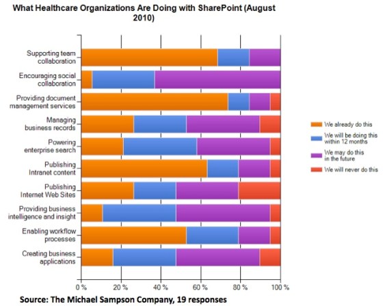 - There is much less use of SharePoint among healthcare organizations for “Encouraging social collaboration” (6% healthcare, 28% overall), “Providing business intelligence and insight” (10% healthcare, 23% overall), and “Creating business applications” (16% healthcare, 37% overall).