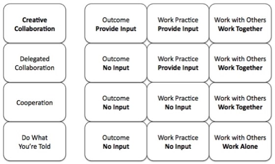 By email (since comments are closed), Peter wrote: “I like the structure but differ about the labels. I would use the Four Cs of Collaboration, Cooperation, Coordination, Compliance from top down on the left.”