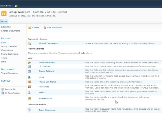SharePoint 2010 ships with a number of pre-defined site templates, list templates, and library templates. One of the new site templates is called the “Group Work Site,” which is described in the creation dialog box as “a groupware solution that enables teams to create, organize, and share information quickly and easily. It includes Group Calendar, Circulation, Phone-Call Memo, the Document Library, and the other basic lists.”