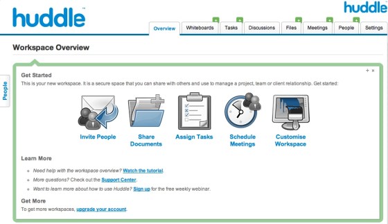 4. When a new Huddle account is created, a first workspace is automatically created for the user. The one in my account was called “Michael Sampson’s workspace.” When clicking into the workspace, a quick overview shows, including a definition of a “workspace” – “a secure space that you can share with others and use to manage a project, team or client relationship.” As with the first-time-user tips on the dashboard, a list of similar easy first steps are offered when clicking into the workspace. There is some visual magic going on too, to link a hover over (on say “Invite People”) with the “People” tab across the top of the screen. In other words, Huddle is nudging you in the direction of safety – that once you close the “Get Started” box, you will be able to find all the links later. Two linkage points were inconsistent – hovering over “Support Center” in the box highlighted “Support Center” along the top, complete with a yellow highlight. Hovering over “upgrade your account” in the box highlighted “Michael Sampson (upgrade)” across the top, but without the yellow highlight.