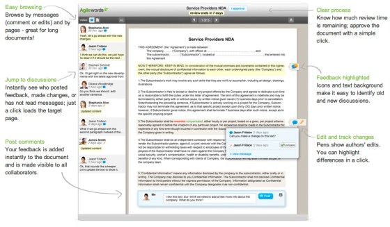 2. With Agilewords, the discussion about the contents of the document is in a separate pane – and it looks like it’s persistent from session to session. Also, the remaining review time is shown at the top of the screen, sending a clear signal about how long someone has to get their edits in.