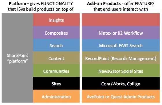So … in the SharePoint world, a platform gives functionality that ISVs build products on top of, and those add-on products are required to make SharePoint usable. Thus the SharePoint decision by implication involves a commitment to both buying the platform and a suite of add-on products, in order to make it work.