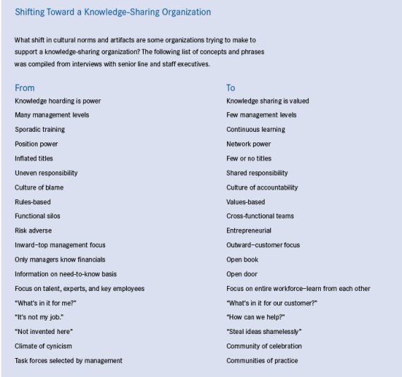 Today I was reviewing my notes for a client project, and saw again the following table from a white paper from The Conference Board in 2000, called Beyond Knowledge Management: New Ways to Work and Learn (it’s on page 48 of the PDF):