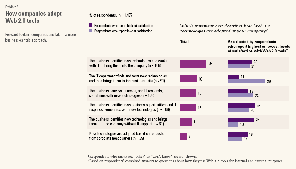 In the McKinsey report on Web 2.0 in the Enterprise from 2008, Exhibit 8 reports on how companies adopt Web 2.0 tools.