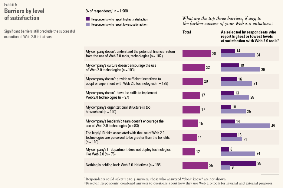 In McKinsey’s 2008 report, Building the Web 2.0 Enterprise, Exhibit 5 correlates perceived barriers to success with current rates of satisfaction with Web 2.0 tools in the enterprise: