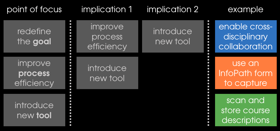 3. When you just focus on introducing a new tool, you have the highest likelihood of either resistance to the proposed change, or that the tool is embraced in the most basic way possible. It doesn’t change the process. It doesn’t affect the goal.