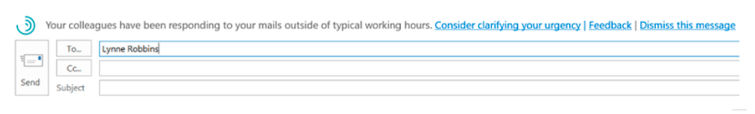 - For reducing after-hours work and team impact – the nudge should include the option for holding the message for delivery until the recipient starts work on their next business day. Outlook already has a delayed delivery capability; this could be leveraged as part of the nudge. And rather than nudging every time, this could be a configurable setting in Outlook – that messages are always delivered at the start of each recipient’s business day (for one-to-one emails).