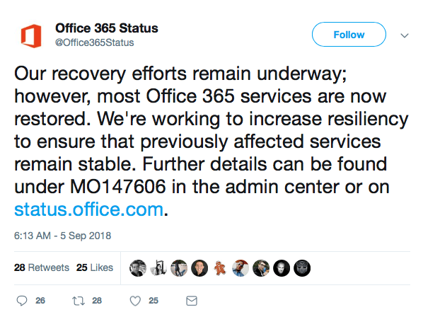 The other avenue was Twitter. At 1.13pm Texas time on September 4, the @Office365Status twitter account posted this update: