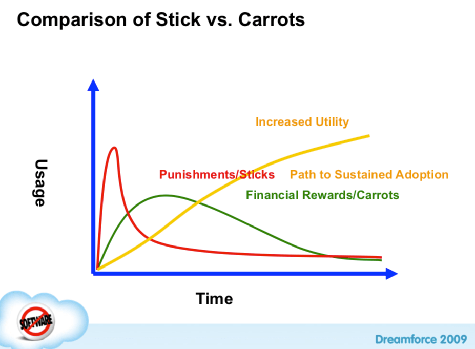 The hardest – and probably the most interesting chapter – was the one on change management, change theories, and other change models. I devoured everything I could, looked at it through the lens of user adoption, and wrote a foundational theory chapter to explore and explain what we could learn from the change literature when focusing on user adoption. One of the cool studies I found was by John McGuigan on the adoption of Salesforce at his firm, Fiberlink Communications. John had presented his material at Dreamforce 2009, along with two others in a session called “The Cardinal Rules of User Adoption.” On slide 12 was a diagram that resonated greatly with me – that the path to sustained adoption was completely around increased utility, or showing / working with / coaching people at Fiberlink Communications how Salesforce would improve their work, their job, and their pay cheque. While other approaches could be used to manipulate a rapid uptake trajectory, it was the slower and more focused efforts around actually making a difference for people that drew my attention, and I included John’s diagram in my book.